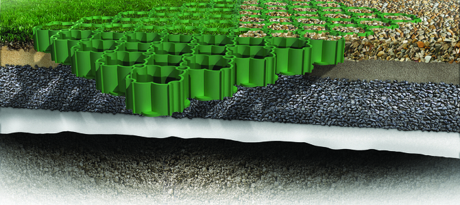 Tiles of rigid honeycomb cells that transfer the weight of a car or pedestrian direct to the sub-base below, limiting damage to grass growing within its cells. It can also be used to lock gravel in place when it is trafficked by domestic vehicles, for example in driveways.